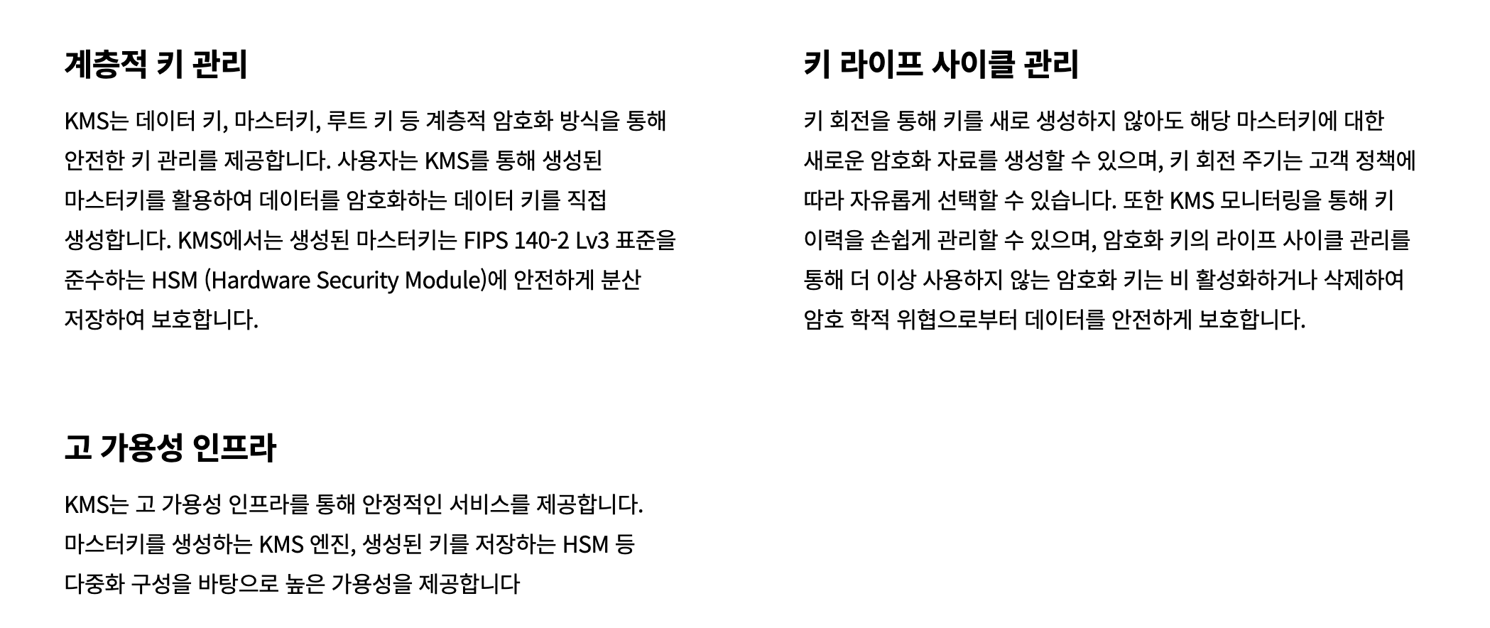 삼성SDS 홈페이지 중 기업에서 제공하는 보안 키 관리 서비스(Key Management Service)에 대한 설명 글.